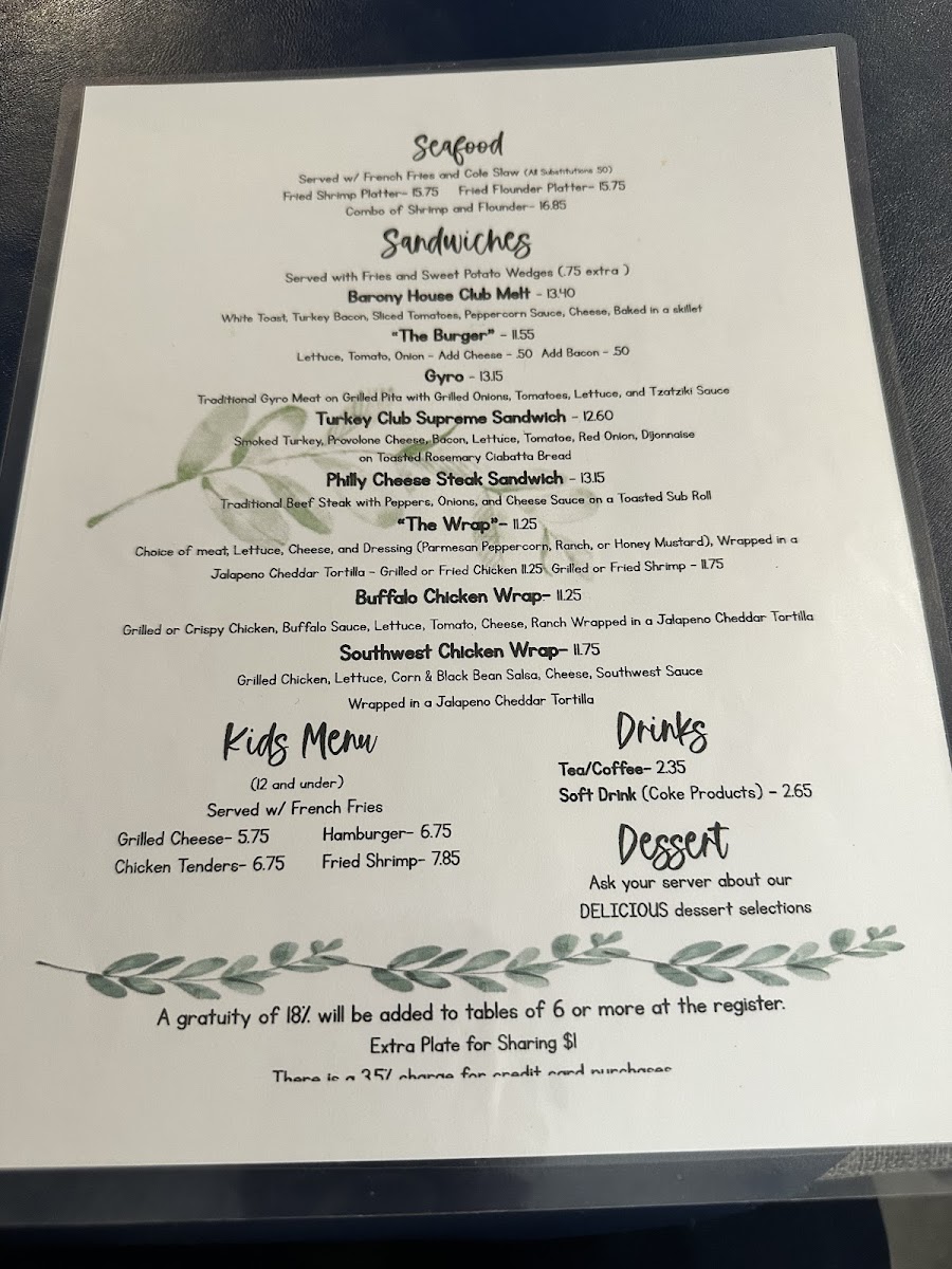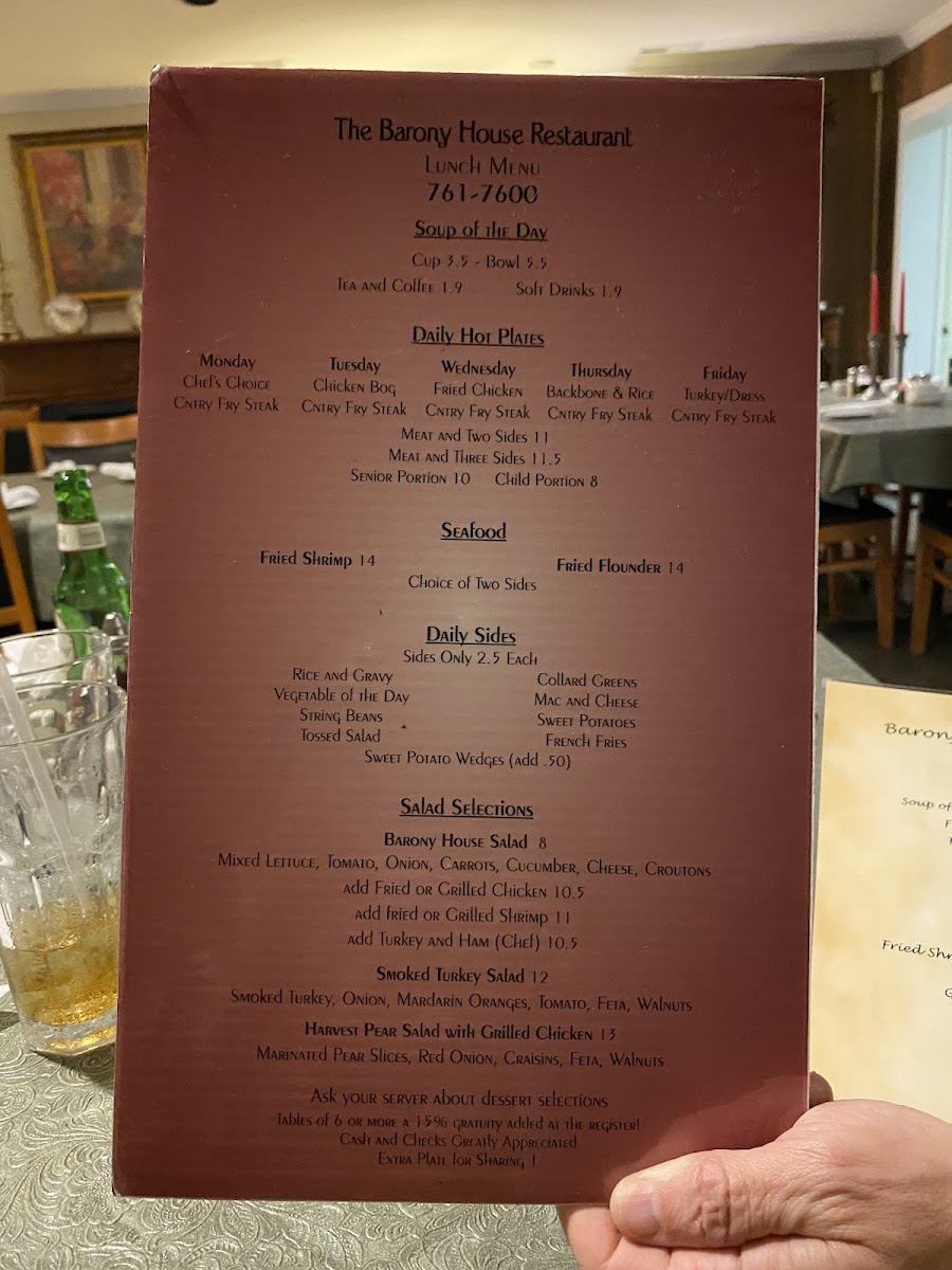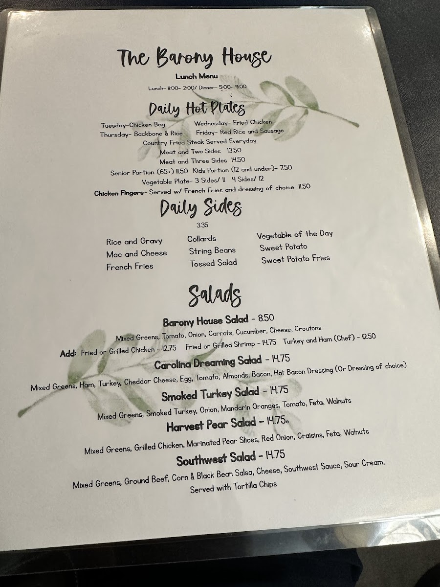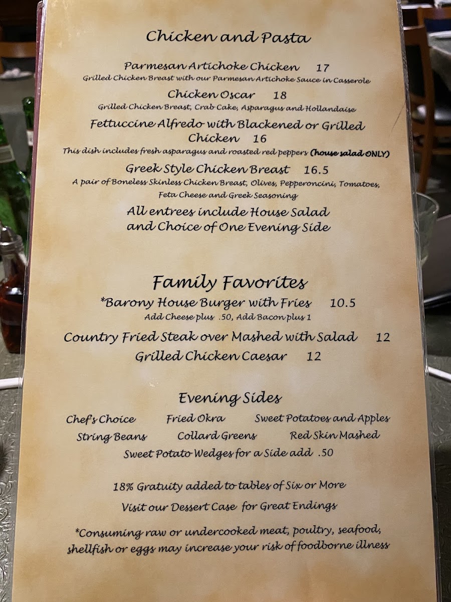 The Barony House serves both lunch and dinner, offering a delightful selection of Southern cuisine that is prepared with fresh ingredients. Popular among diners are the “meat and three” offerings, especially on Sundays, accompanied by fluffy biscuits that melt in your mouth. The lunch menu features a variety of hot sandwiches and crisp salads, catering to every palate.